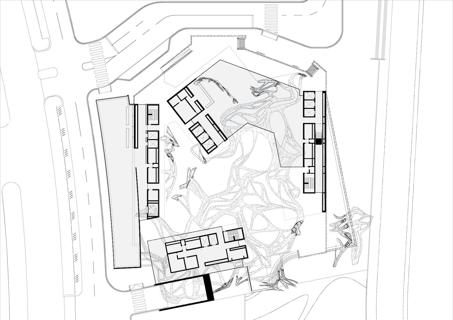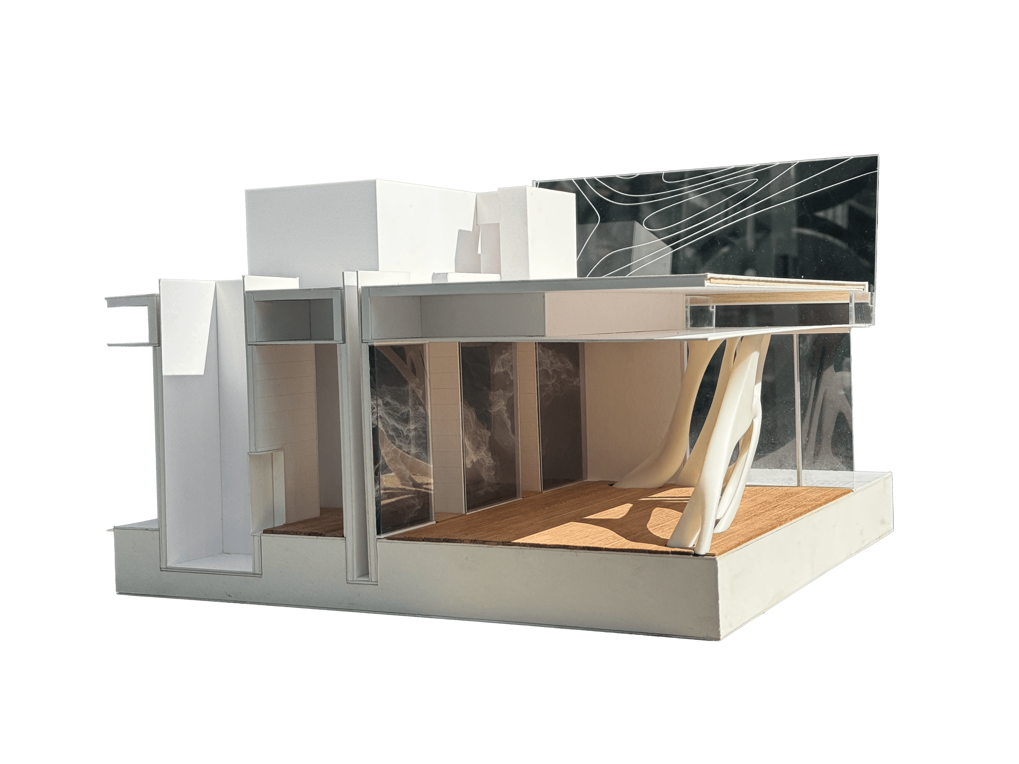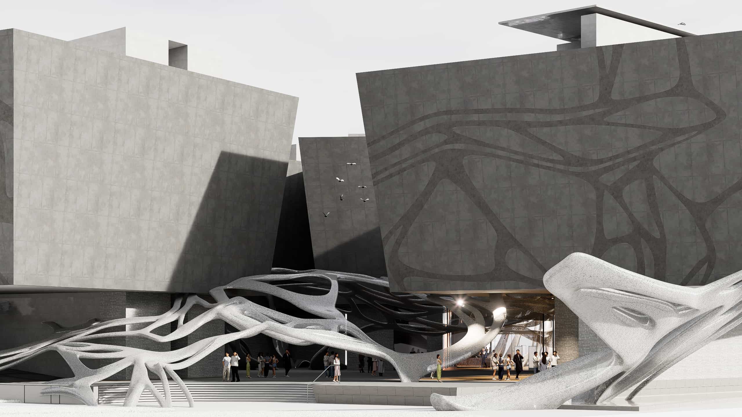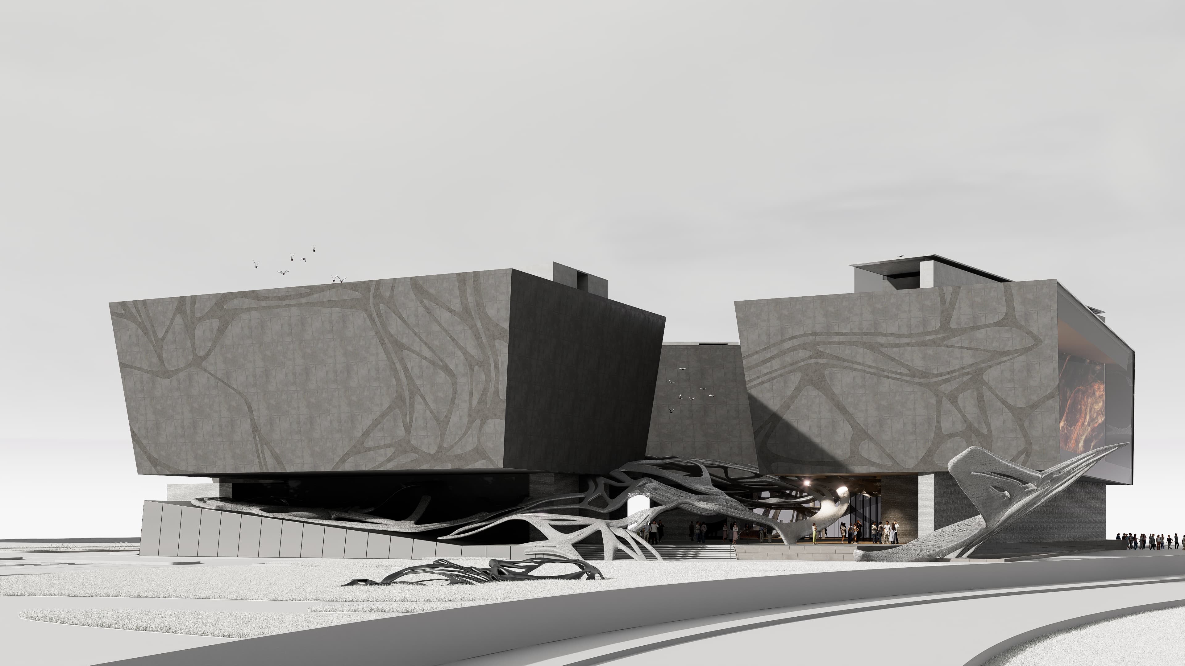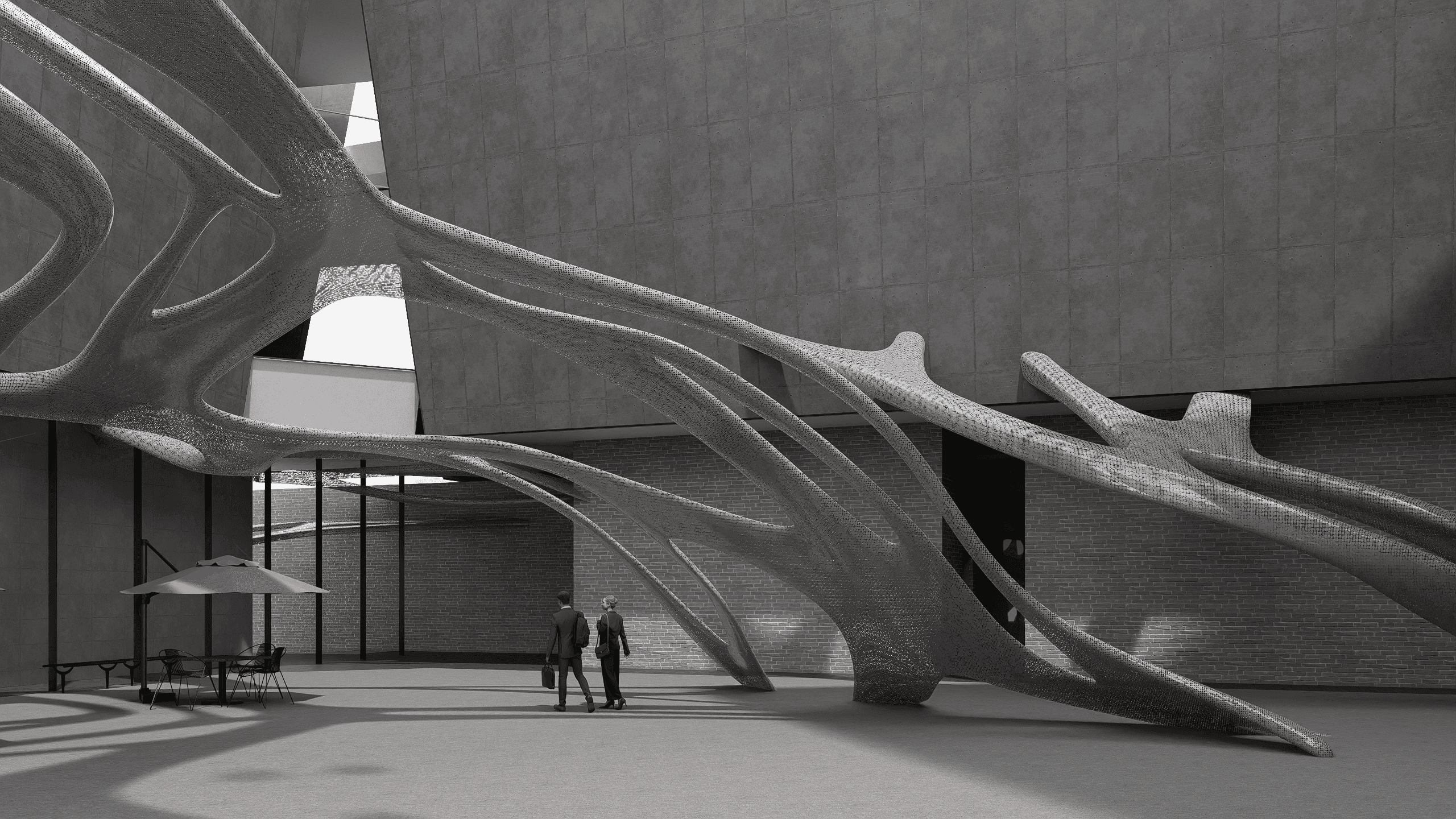 The building emerges as a living organism, its form shaped by a growth algorithm inspired by the natural spread of moss and vines across rocks. These organic processes guide both the accumulation and articulation of the architecture, creating a continuous and evolving surface that integrates structure, landscape and art. The veins and moss-like forms of the building are realized through 3D printing in steel and concrete, giving the architecture a tangible and sculptural presence. Visitors navigate through the building as though moving within an artwork itself, encountering expressions and installations embedded within the evolving environment.