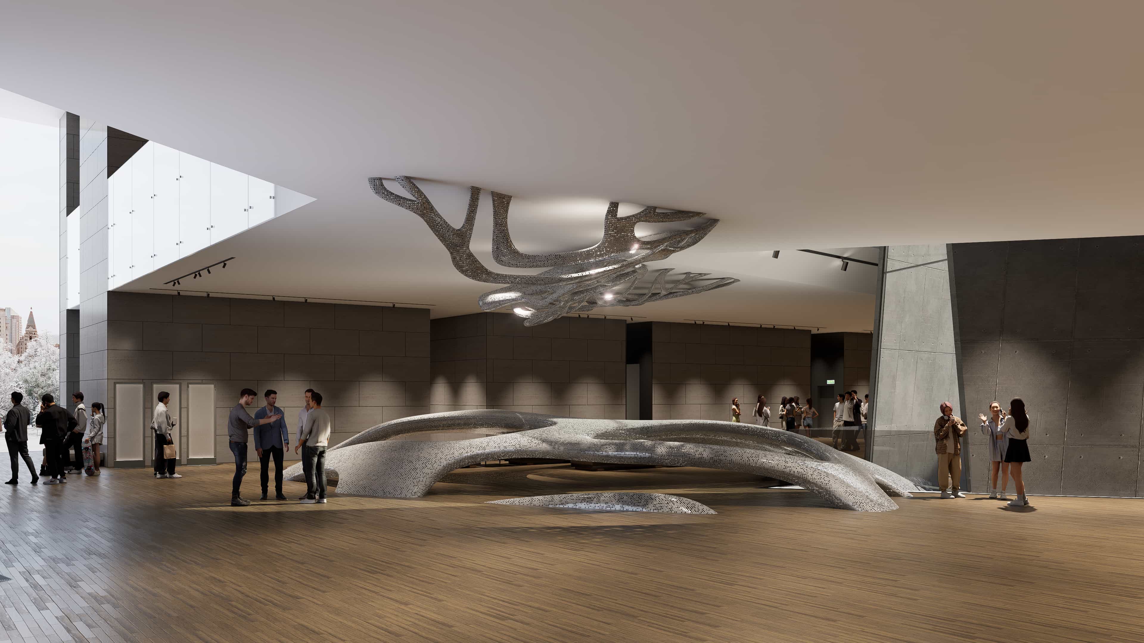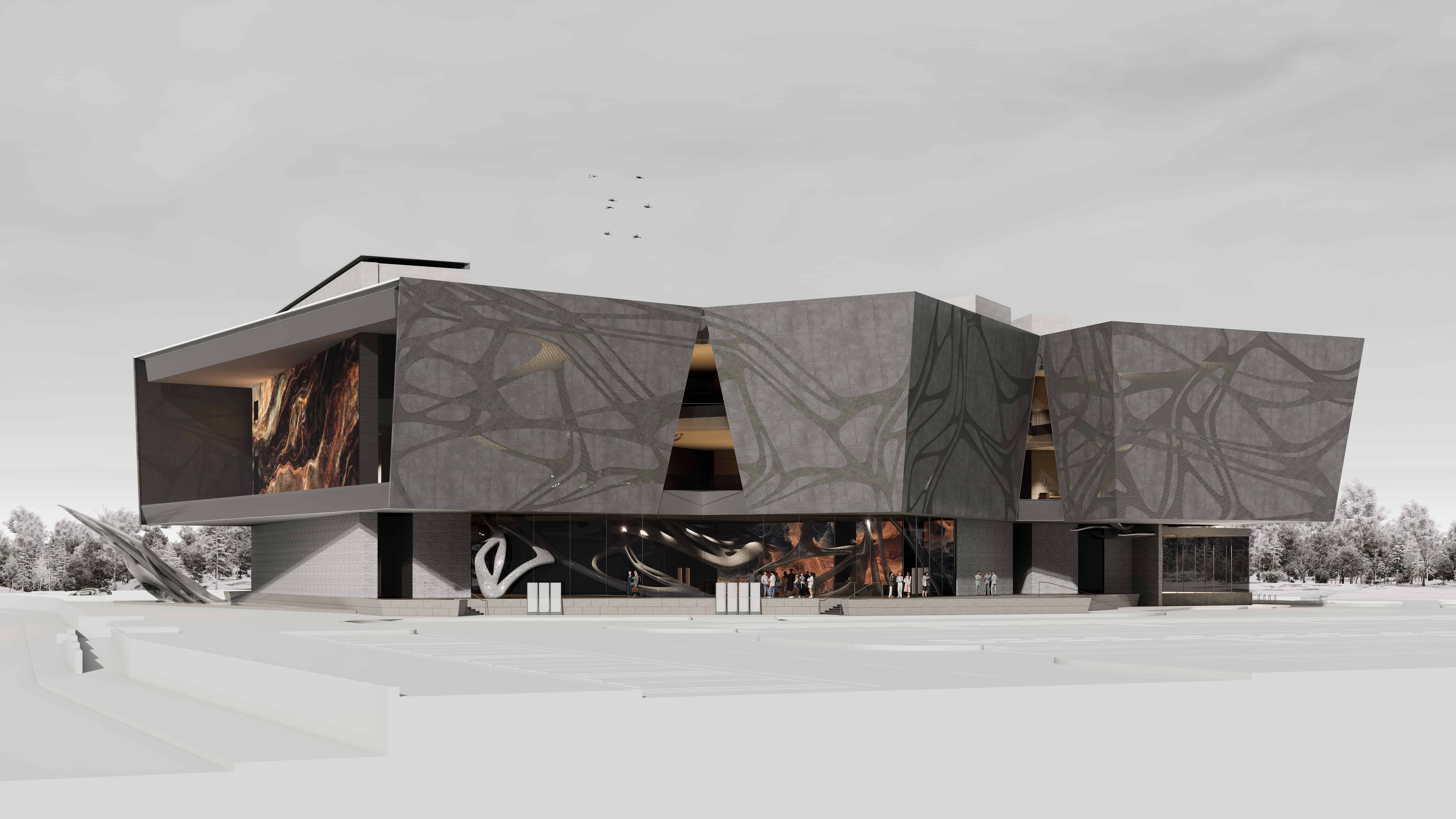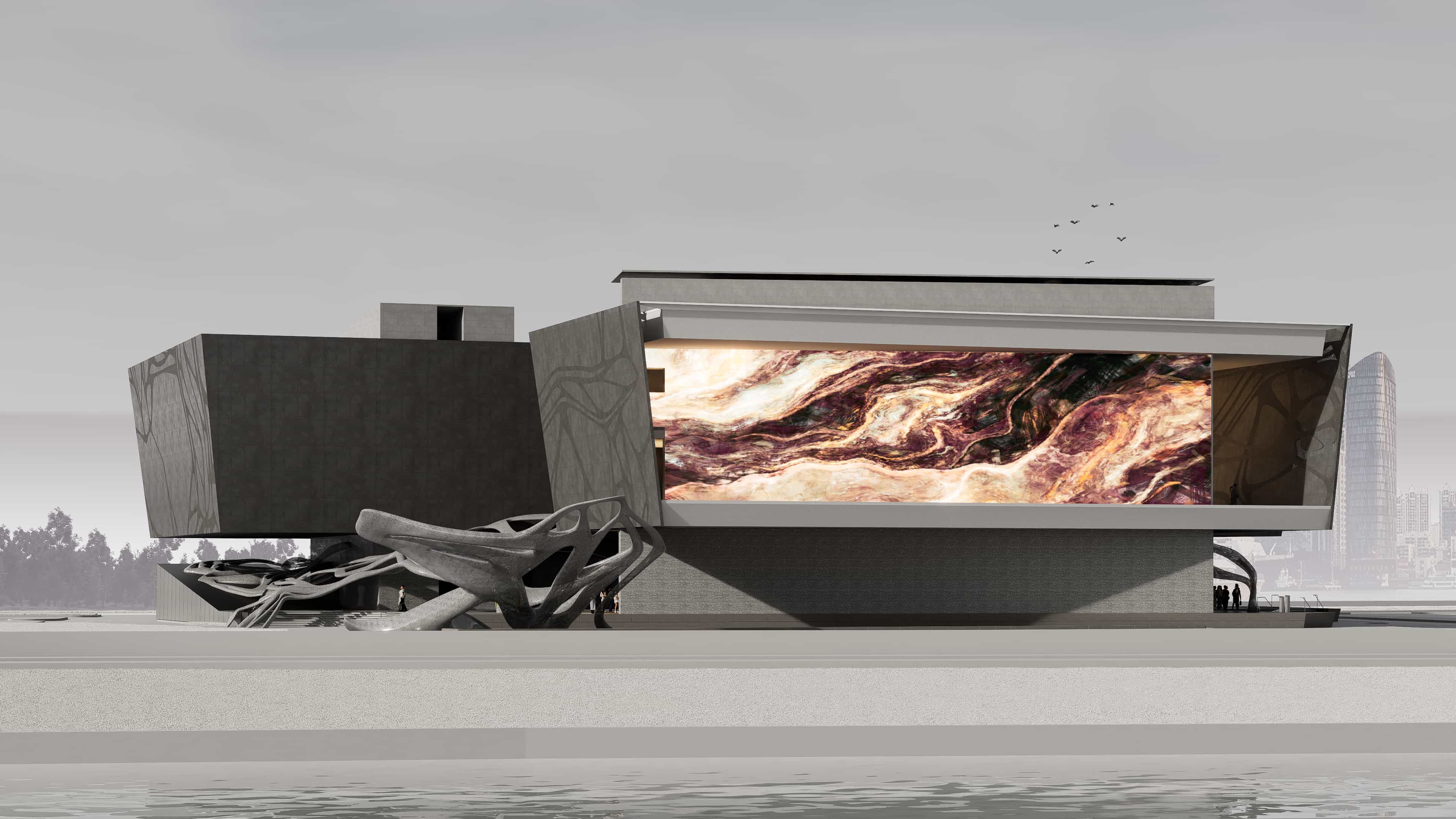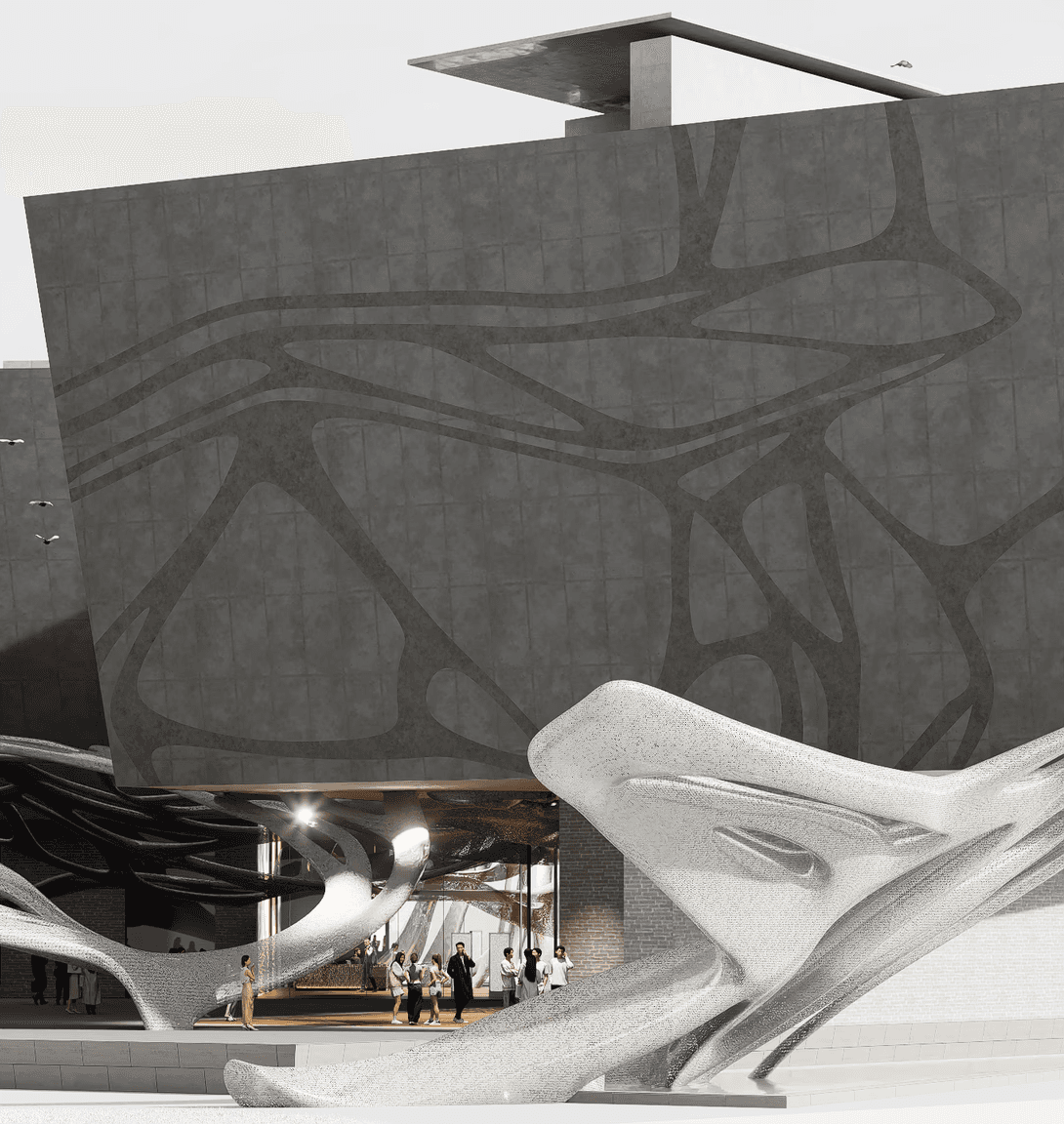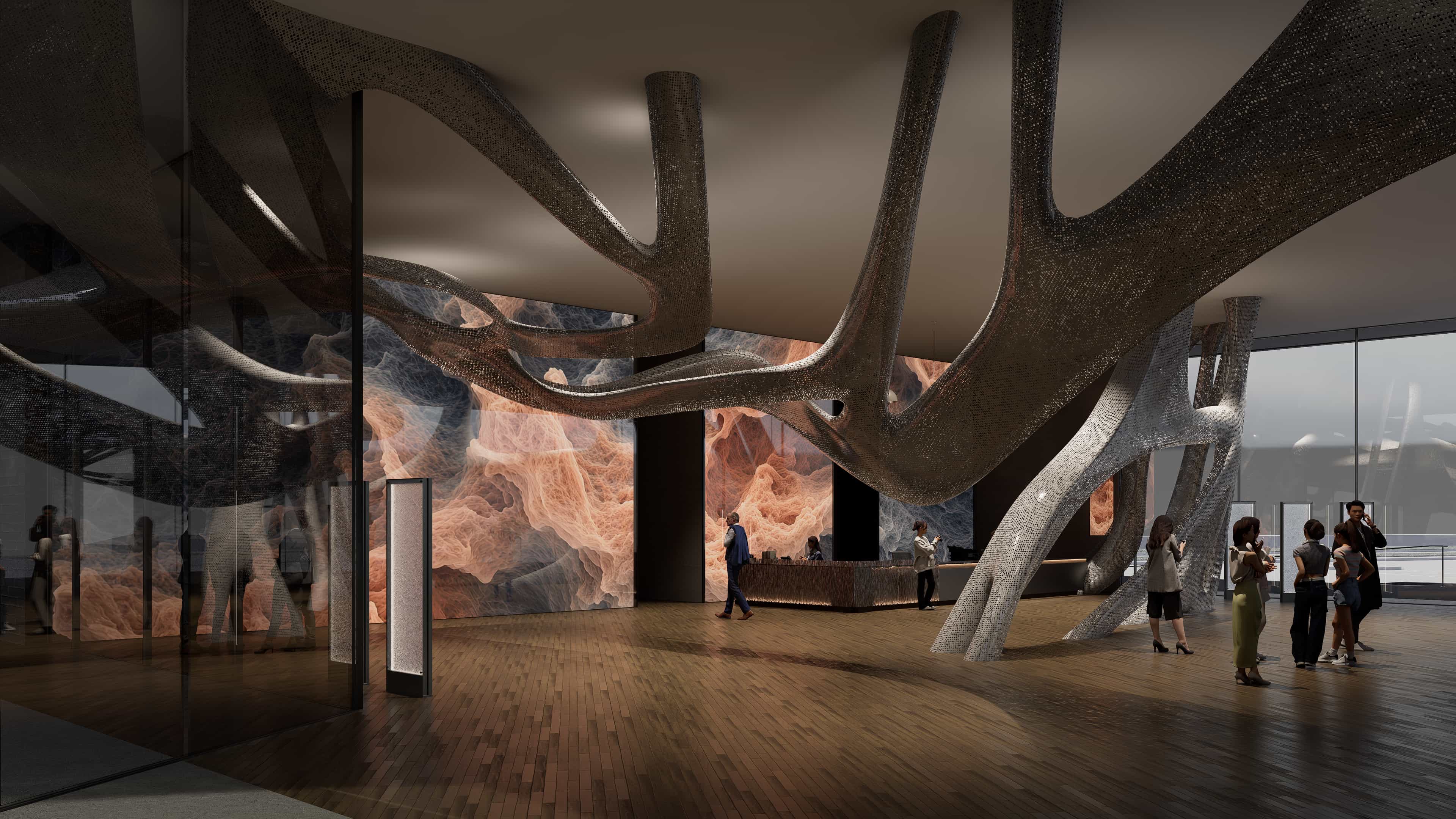The building's organic processes guide both the accumulation and articulation of the architecture, creating a continuous, evolving surface that integrates structure, landscape, and art. The veins and moss-like forms are realized through 3D printing in steel and concrete, giving the architecture a tangible, sculptural presence. Visitors navigate through the building as though moving within an artwork itself, encountering expressions and installations embedded within the evolving environment.