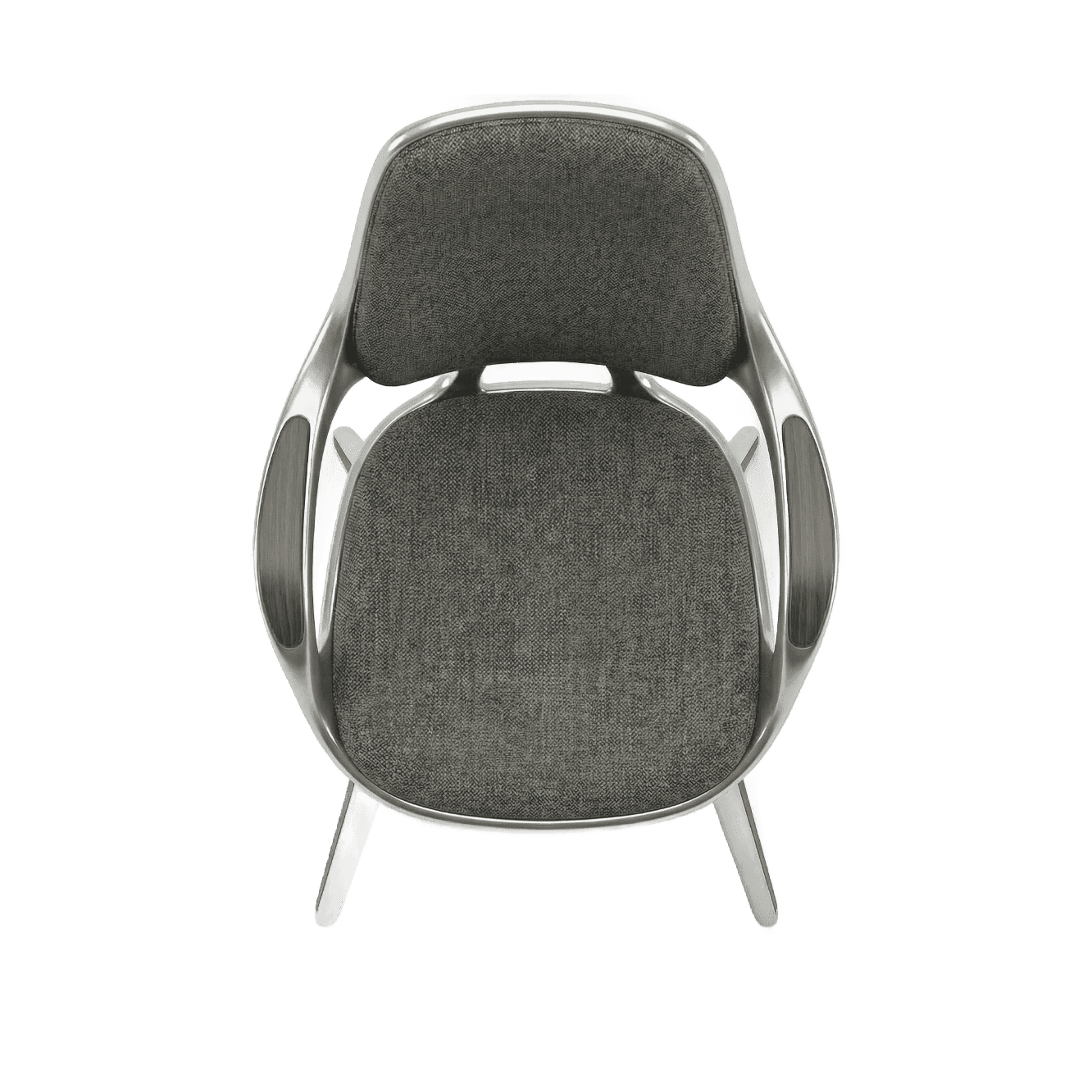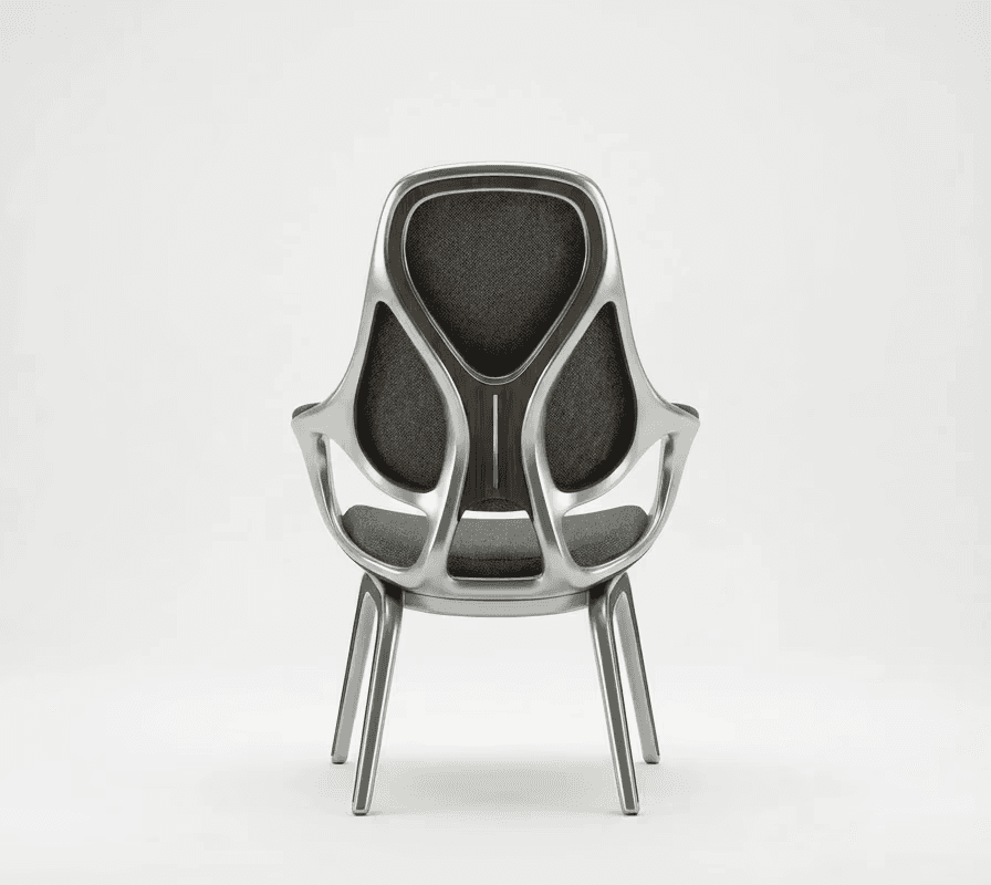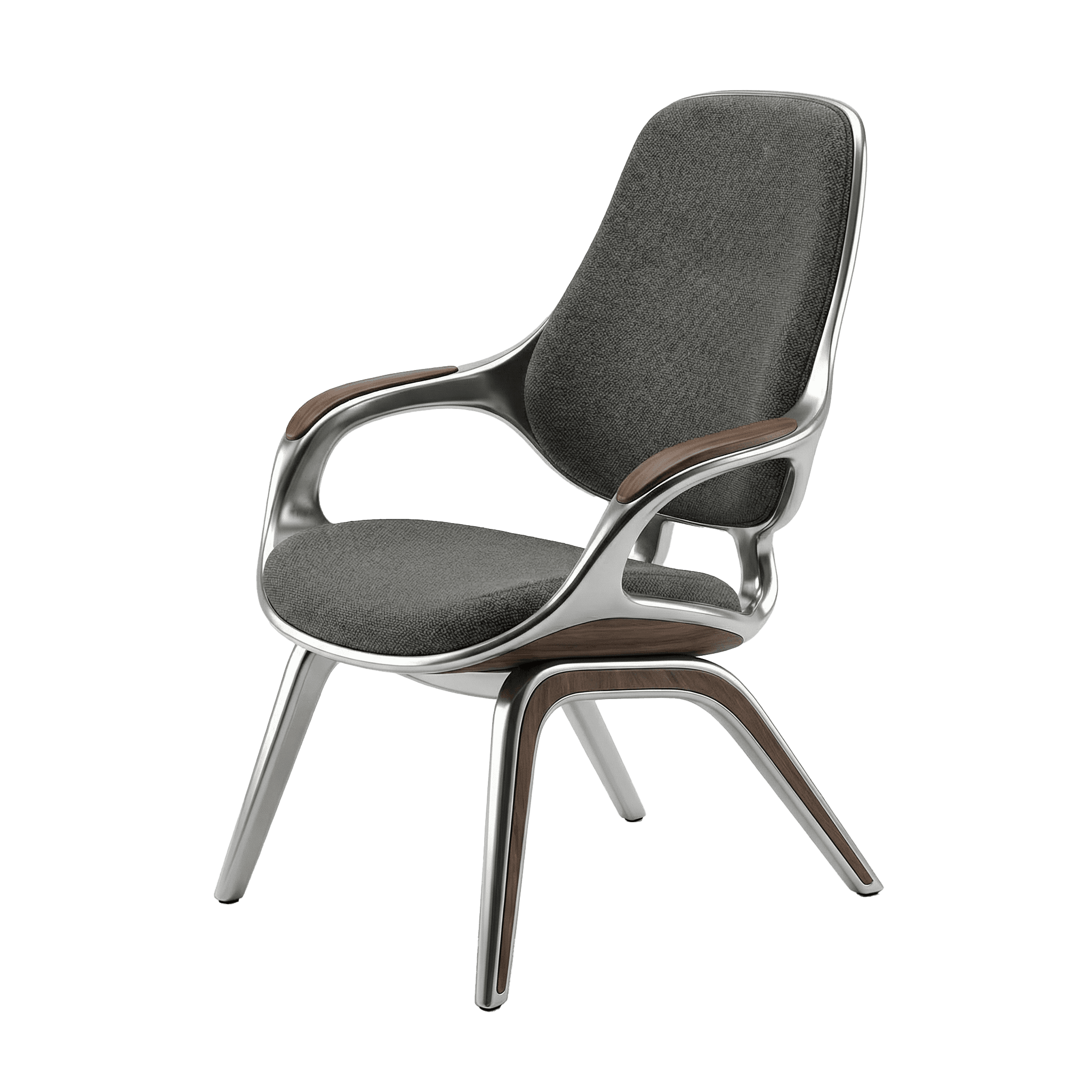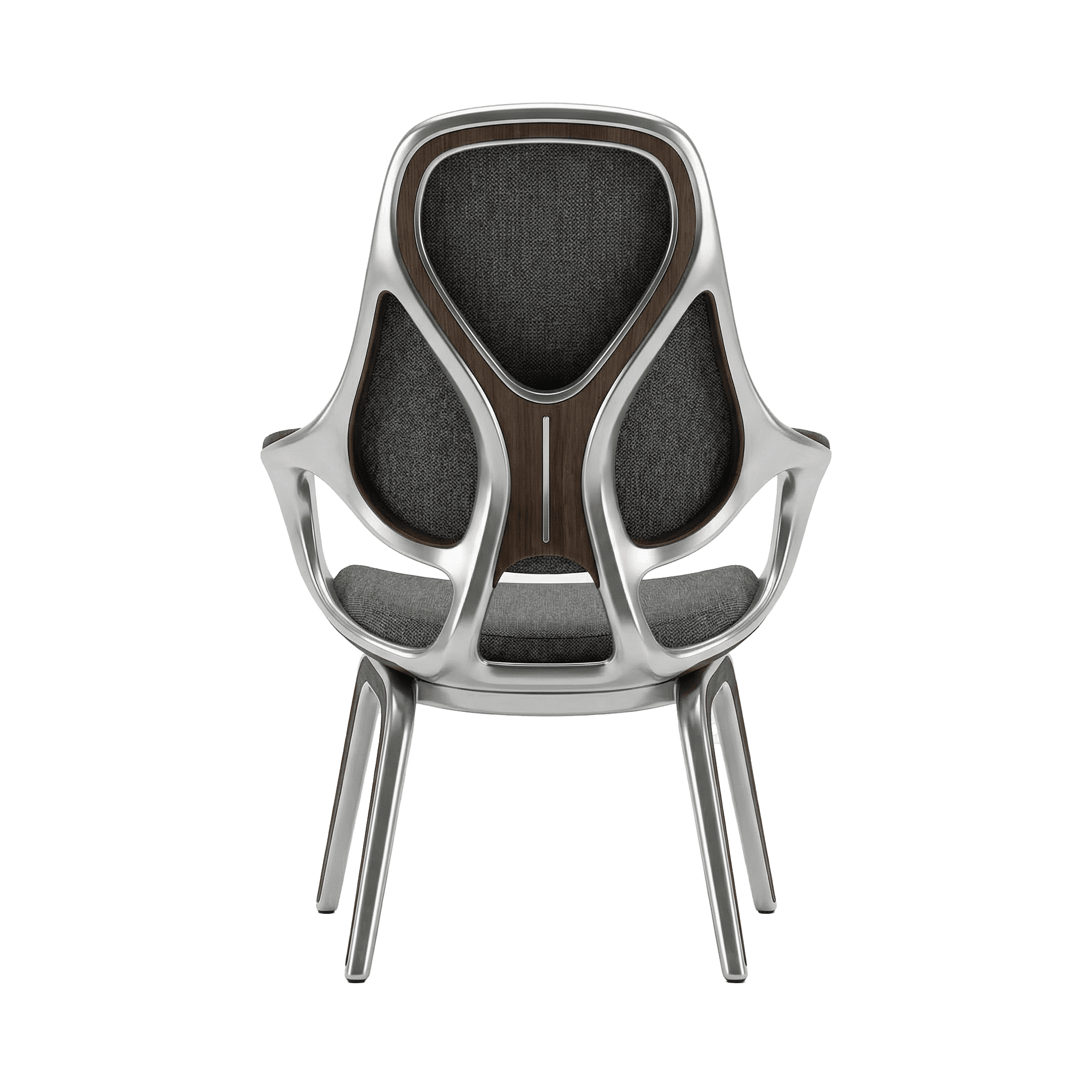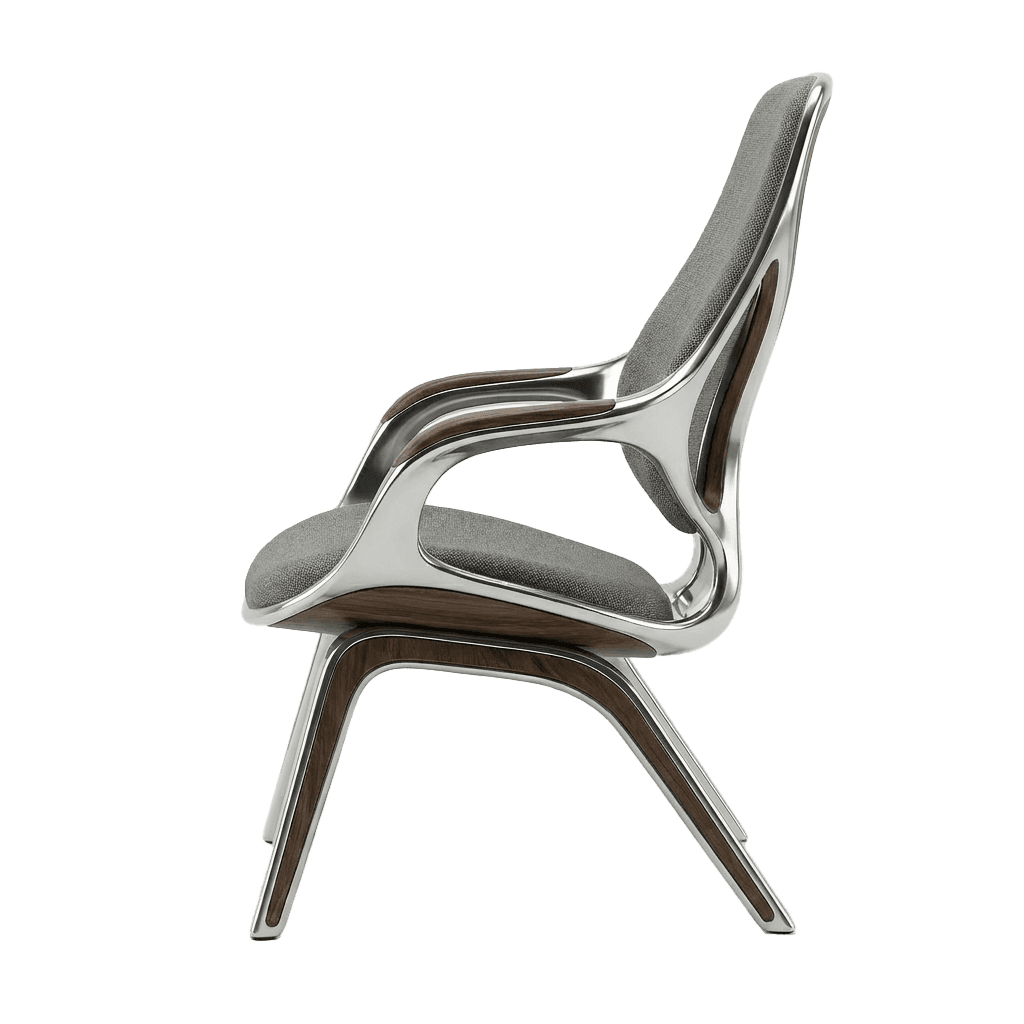 The chair begins not with comfort but with continuity. A single cast aluminium gesture flows uninterrupted from foot to leg to arm to backrest, compressing structure, enclosure and occupation into one tectonic proposition. Where conventional furniture separates what holds from what is held, this design refuses that division. Where the frame bifurcates at the rear to distribute load across the backrest, structural necessity becomes formal intention, the point at which the chair declares its own organisational depth. American walnut enters precisely where the logic of metal reaches its limit, marking the threshold of contact with a material that holds temperature and registers touch differently across time. Woven textile receives the body within the geometry of the frame, not applied over it. Three materials, three registers, one continuous argument. This is architectural thinking at the scale of the body.