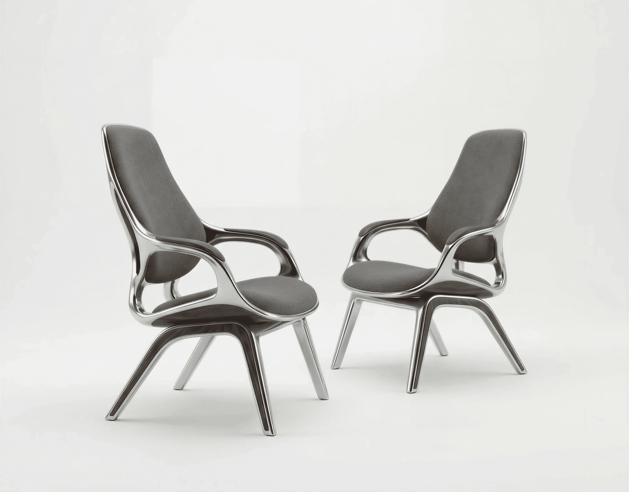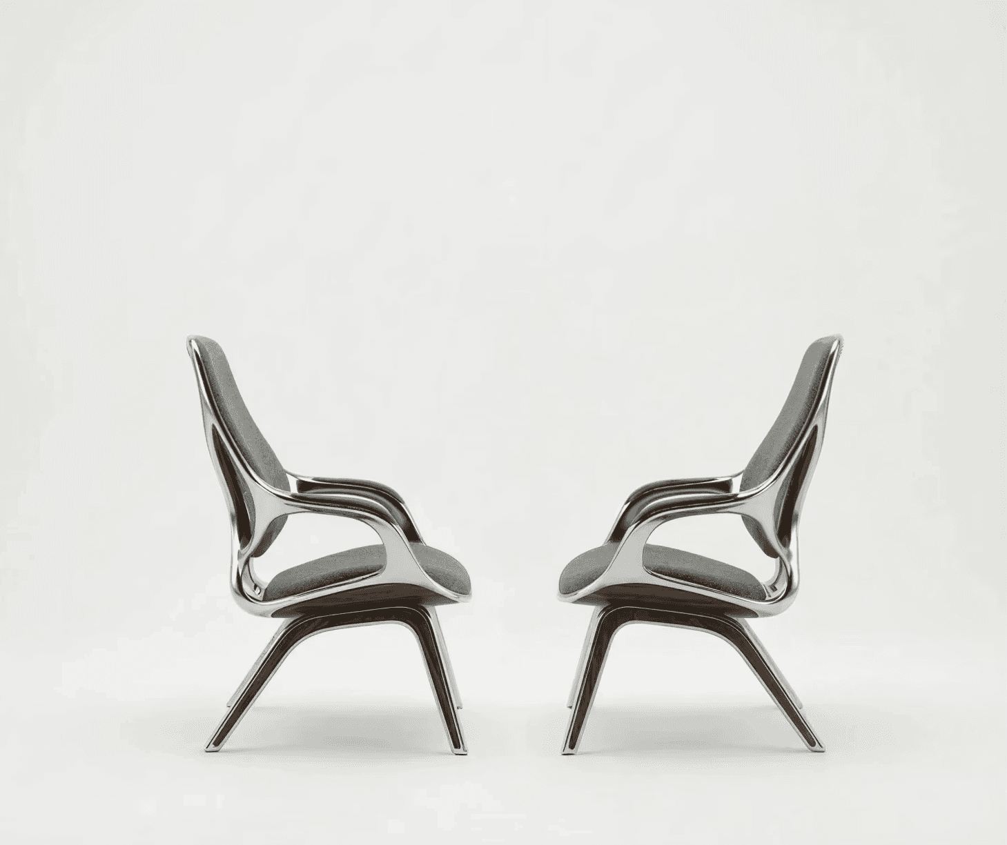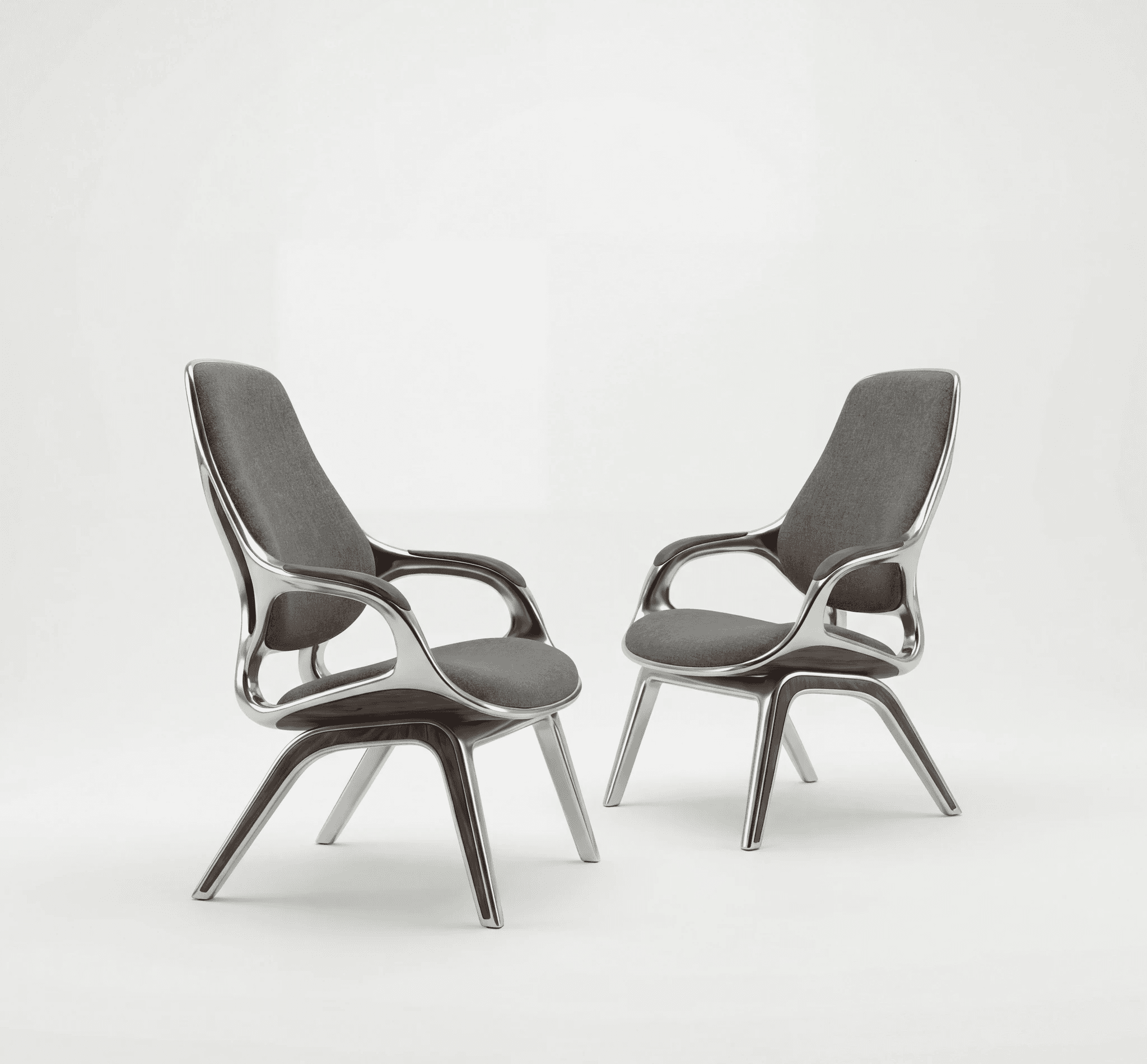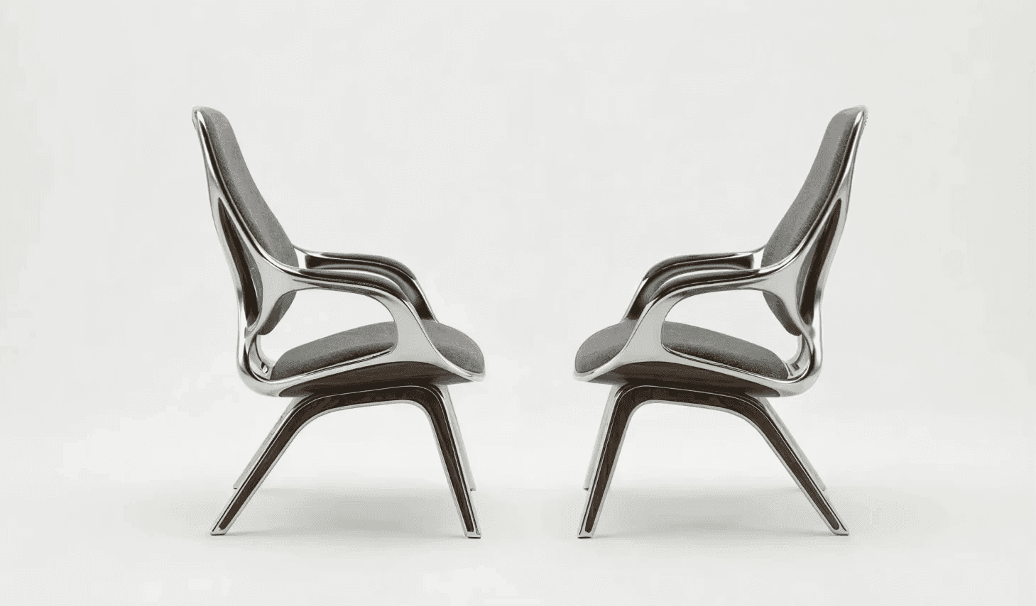 The chair begins not with comfort but with continuity. A single cast aluminium gesture flows uninterrupted from foot to leg to arm to backrest, compressing structure, enclosure and occupation into one tectonic proposition. Where conventional furniture separates what holds from what is held, this design refuses that division. Where the frame bifurcates at the rear to distribute load across the backrest, structural necessity becomes formal intention, the point at which the chair declares its own organisational depth. American walnut enters precisely where the logic of metal reaches its limit, marking the threshold of contact with a material that holds temperature and registers touch differently across time. Woven textile receives the body within the geometry of the frame, not applied over it. Three materials, three registers, one continuous argument. This is architectural thinking at the scale of the body.