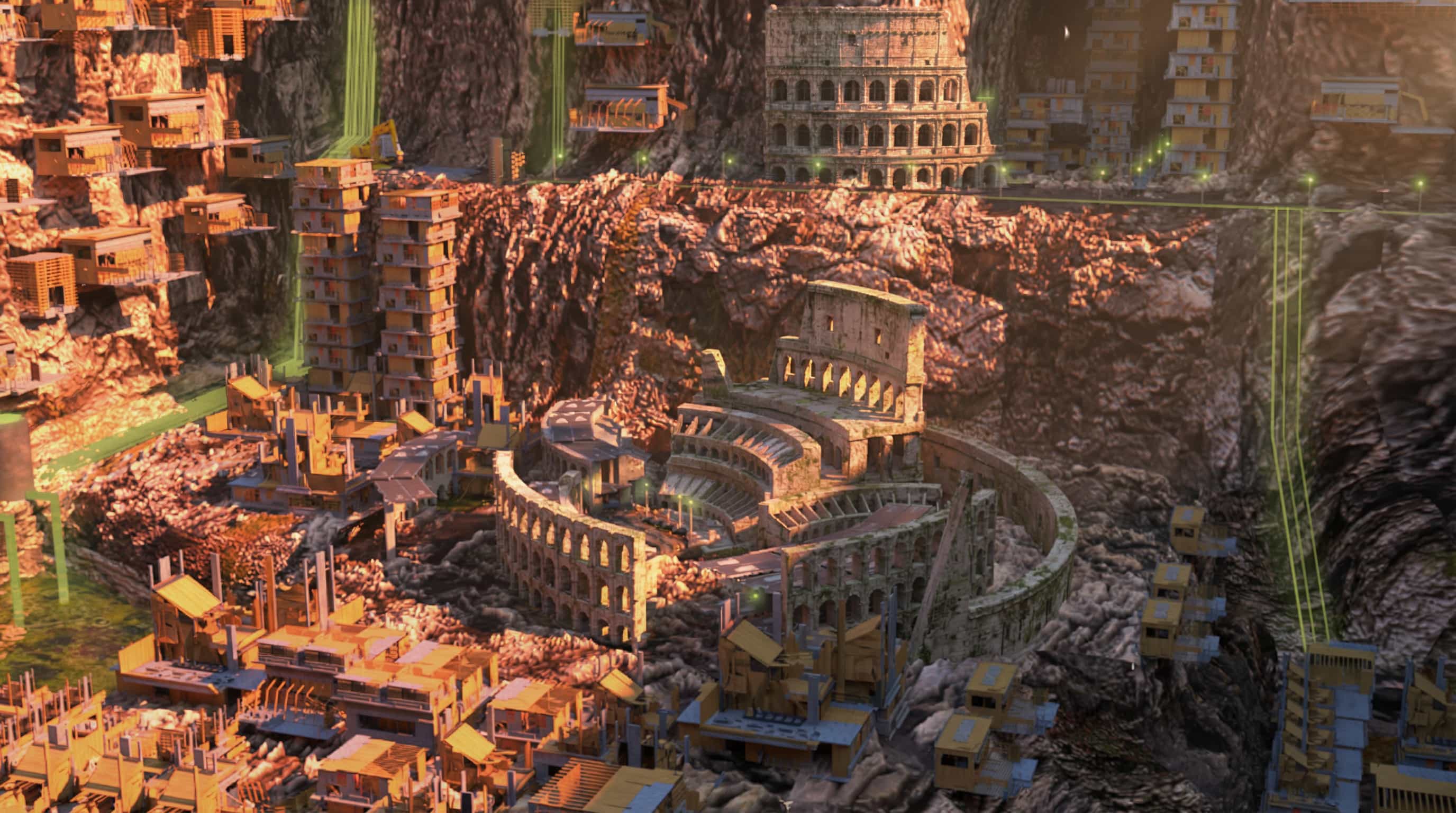 The world’s end and the whole world’s civilization must live within one area, chosen to be confined to a limestone mine of fertile consumption is the civilization tries to survive the barren wasteland that earth has become. The entire population having to work together to scavenge and provide for each other. This project idolieses the last living plant left on earth situated at the bottom of the limestone mine. The goal is to survive so the plant is nurtured and cared for to create architecture around it allowing it to grow. As it grows so does the architecture of the world. Confined to strict materials of one home chosen to be saved before the disaster those materials are all that is available to build everything and survive. Bringing together the plant and human life with limited resources entitles new way of design and thinking. Humans and the plant in a harmonious relationship which both benefit and grow. Developing a whole ecosystem and city within, which continuously grows, while choosing to preserve elements of the old world such as the Colosseum which becomes the main hub of civilization. Four cabins are constructed along with machines and transport form the given materials and scavenged resources left in the mine.