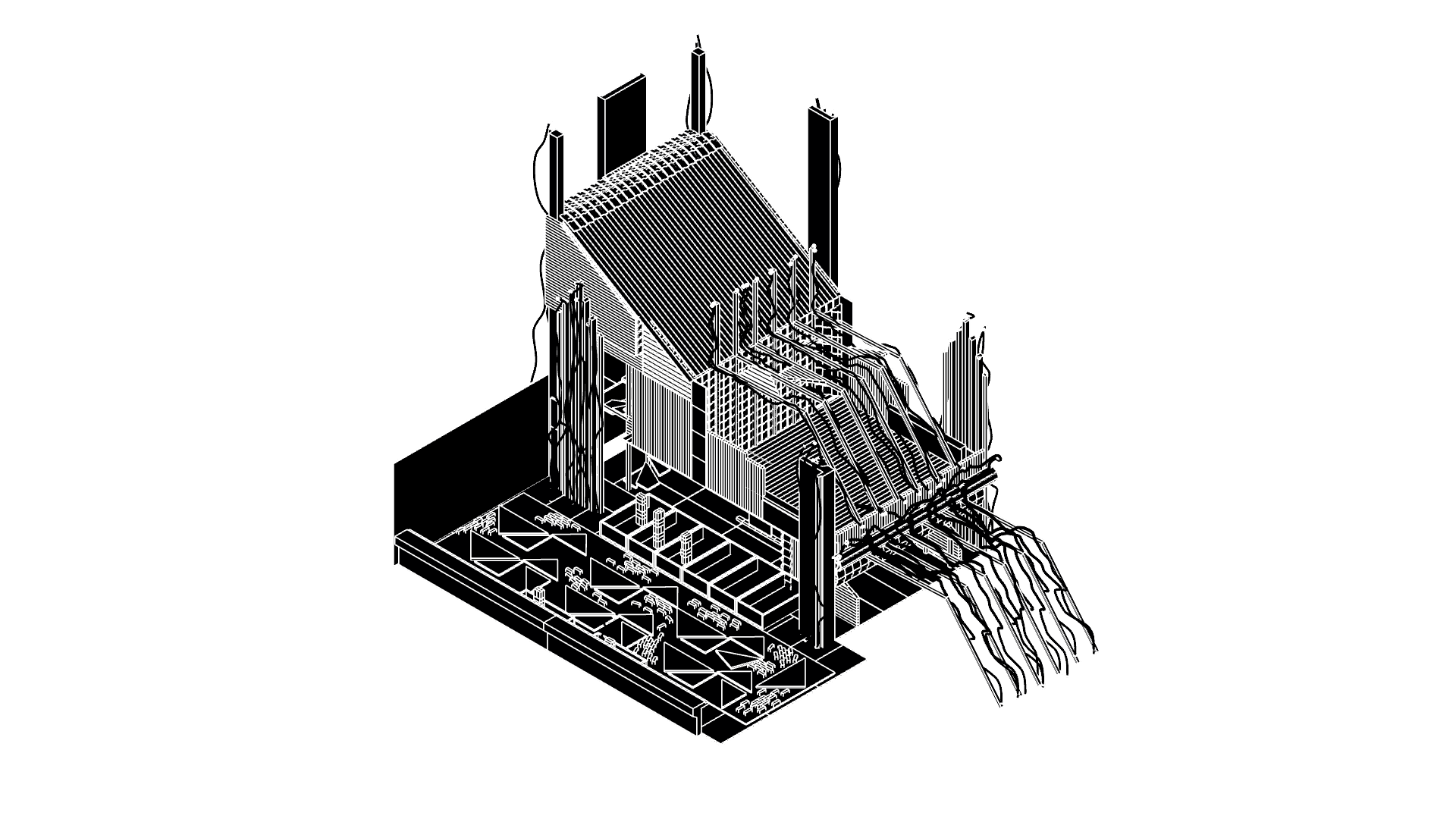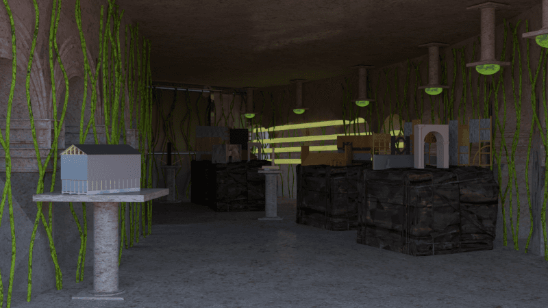 The city emerges from accumulated matter and memory, assembled from salvaged parts and humble materials. This hall preserves those memories, from the homes that gave rise to it to the scraps and containers once used to transport the column into the civilisation.