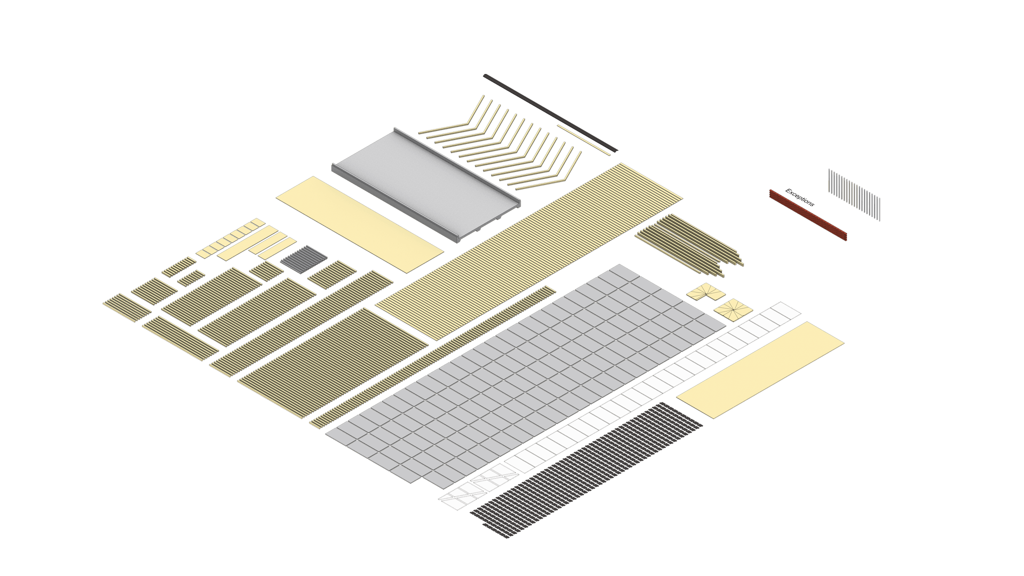 Each cabin has been meticulously crafted using components sourced from the Nishichiyoda home in Japan. These materials are employed only once per cabin, reinforcing a disciplined approach to reuse while deliberately introducing material constraints that shape the project’s logic. Rather than drawing from the vast and indiscriminate catalogue of materials available in the contemporary world, the design operates within a carefully bounded material economy, allowing restriction to become a coherent and generative architectural principle. However an exception was made to aquire 200 bricks and 21 steel beams. With a total Kit of parts adding up to 1,472 pieces.