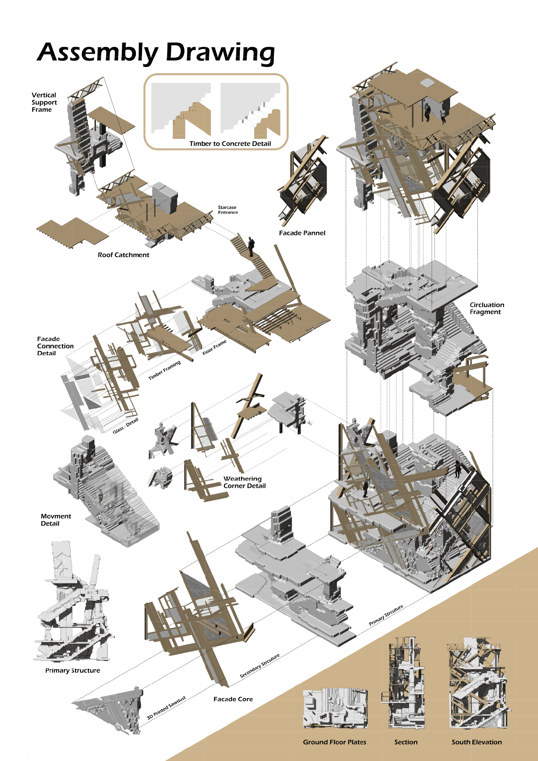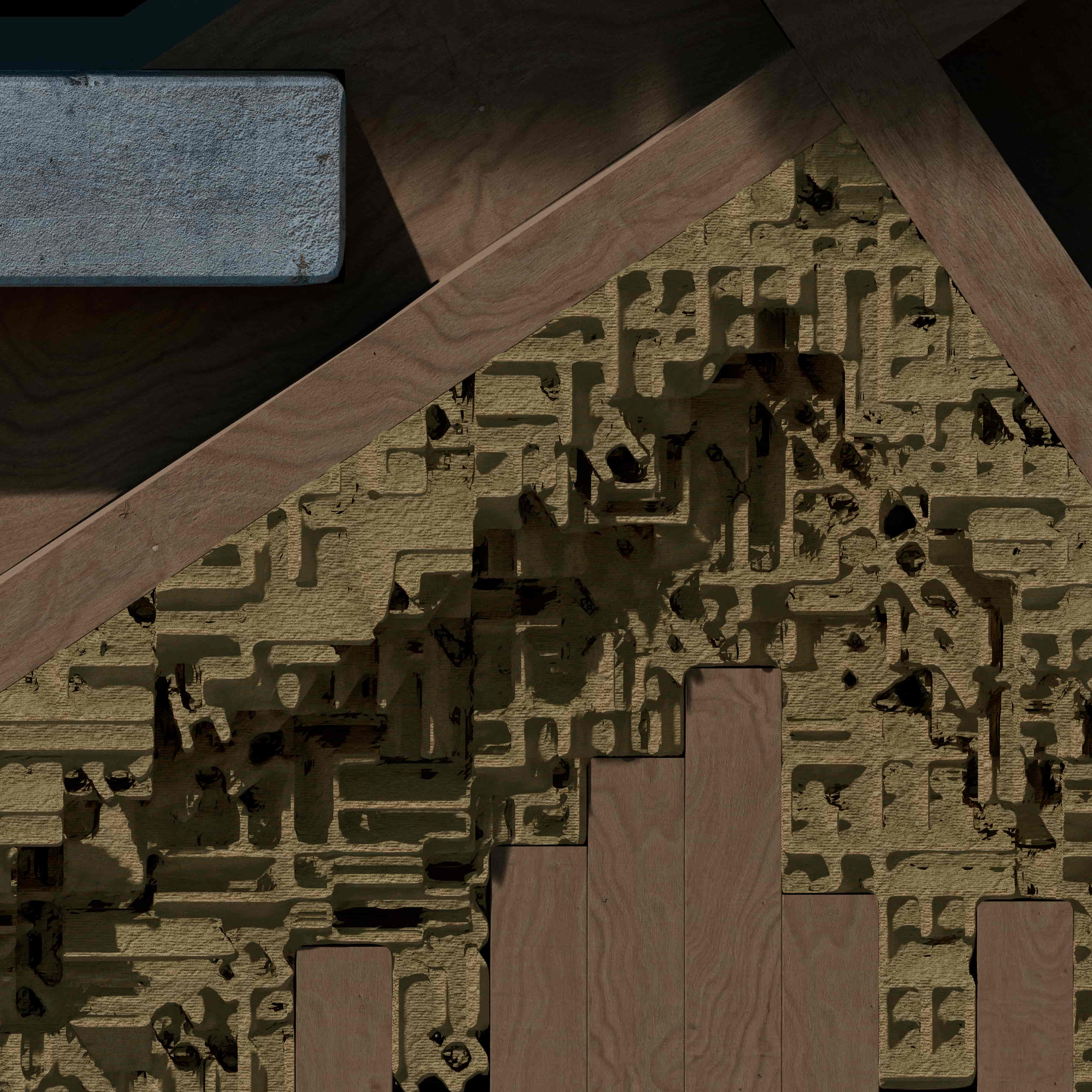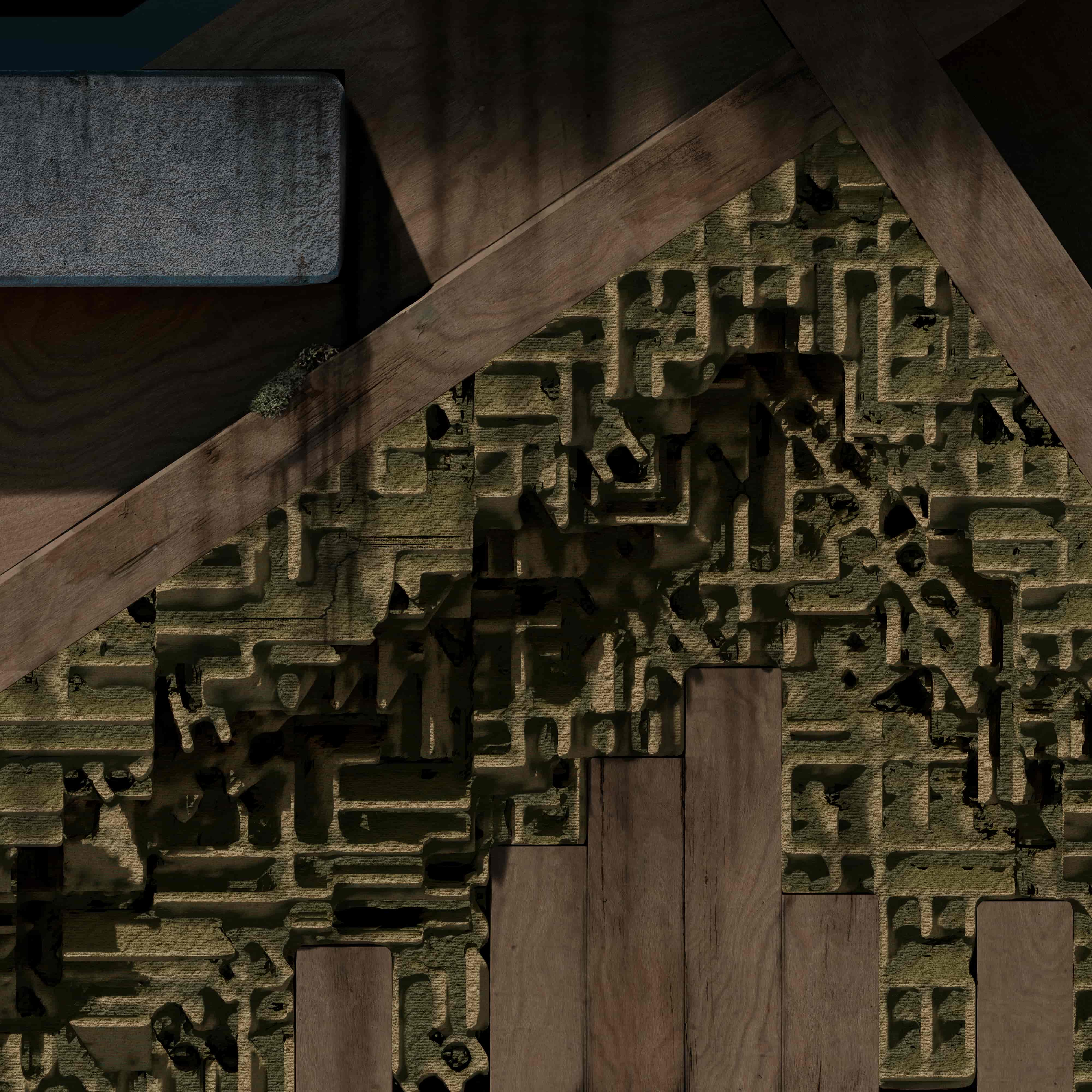 The most fragile and experimental components occur at the tertiary scale. These finer elements are designed as responsive surfaces that actively capture environmental matter. The use of 3D printed sawdust components allows the building to collect dust moisture seeds and airborne particles accelerating ecological growth while also concentrating zones of material breakdown. These elements are sacrificial by intent. Their degradation transfers stress away from more durable systems while recording environmental conditions through visible change. Damage is therefore redirected and curated rather than avoided.
