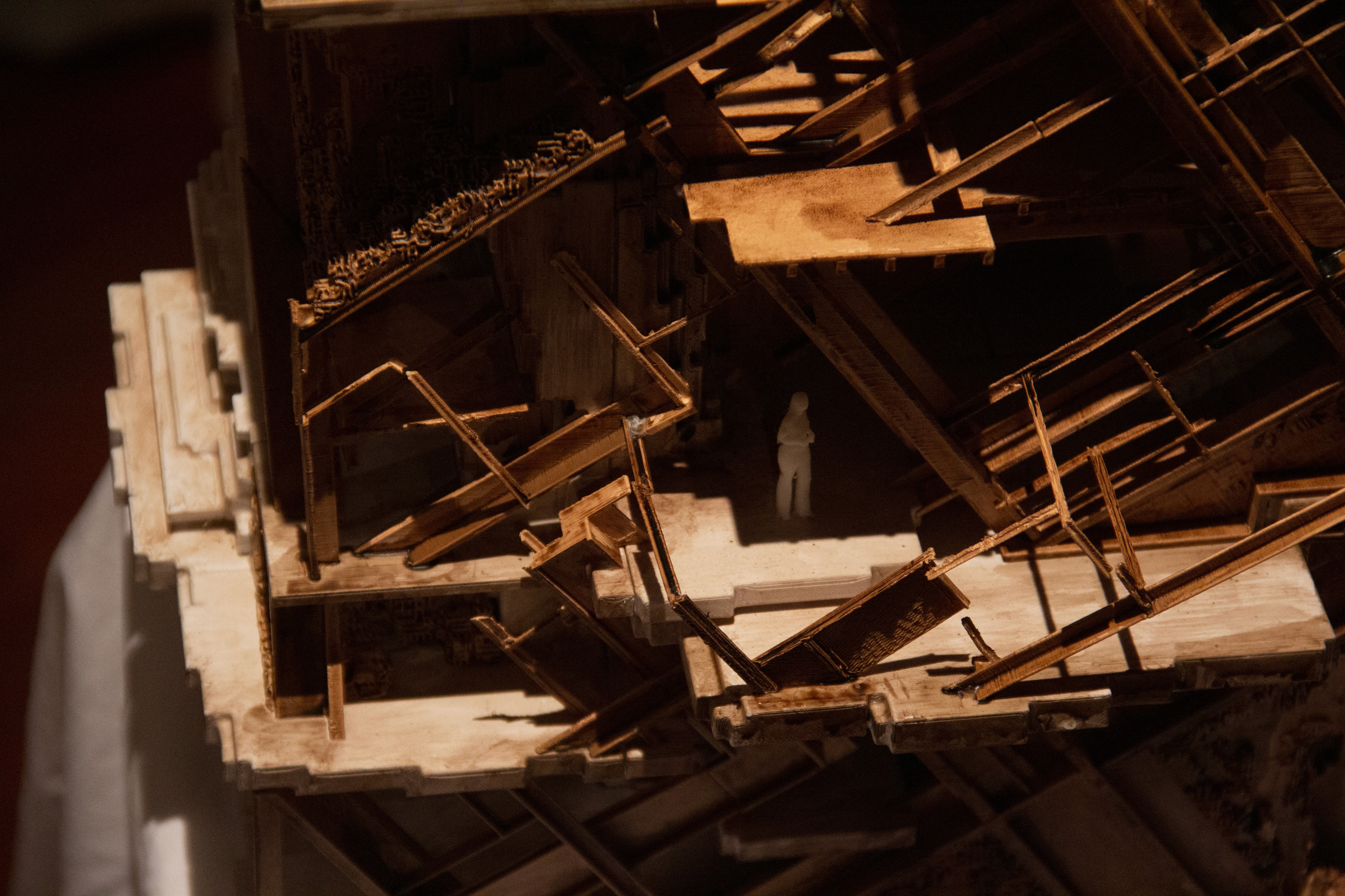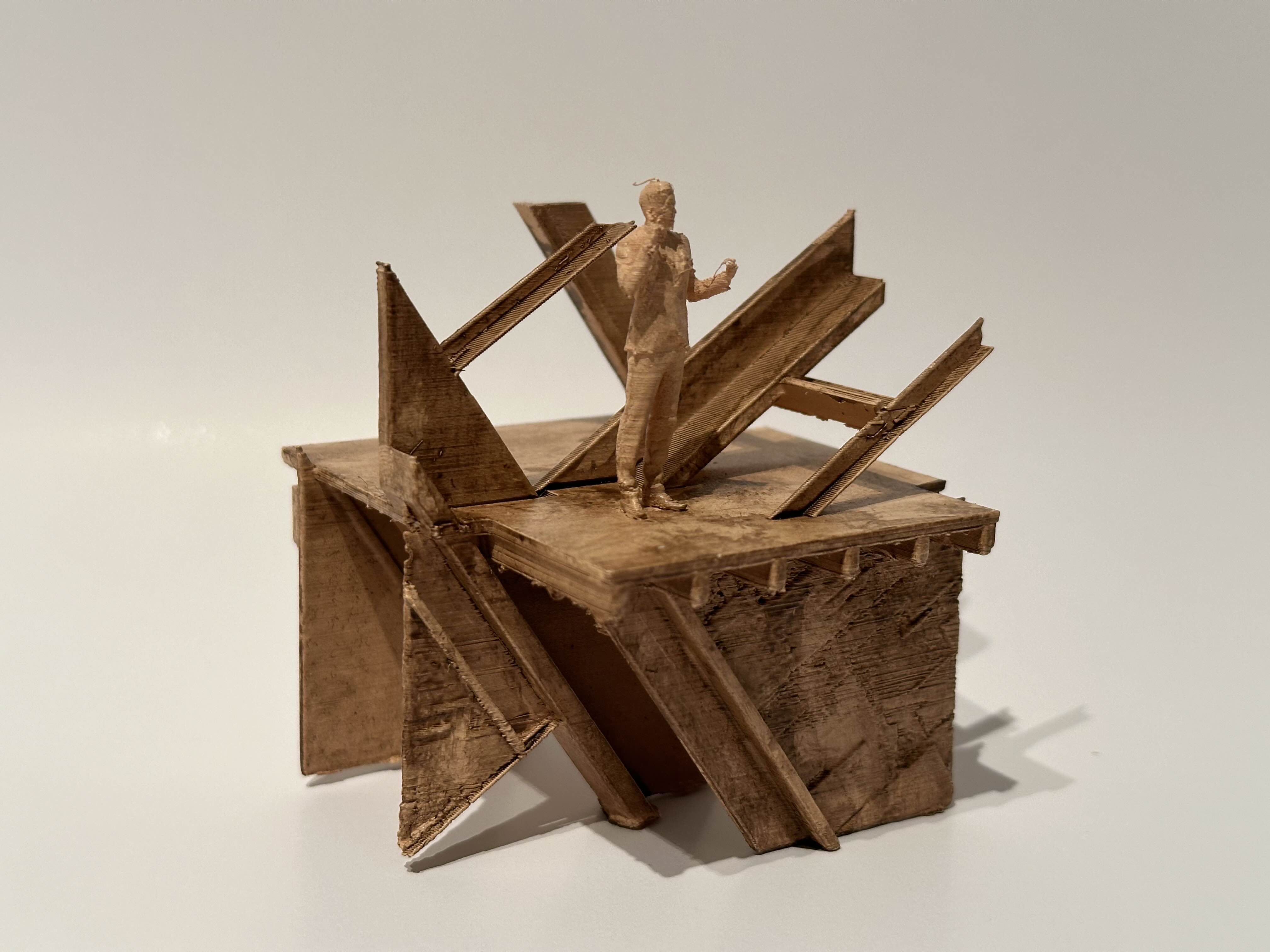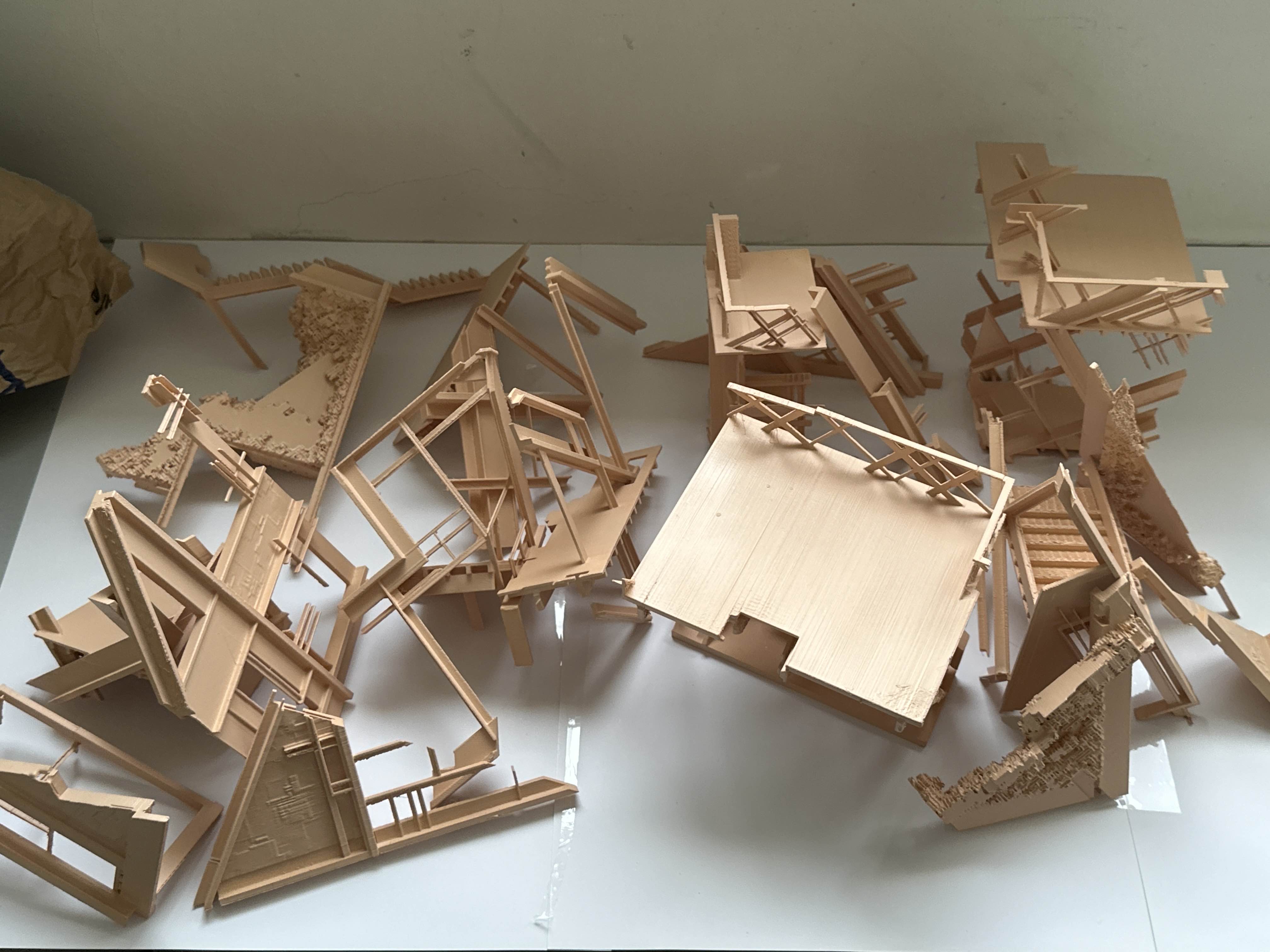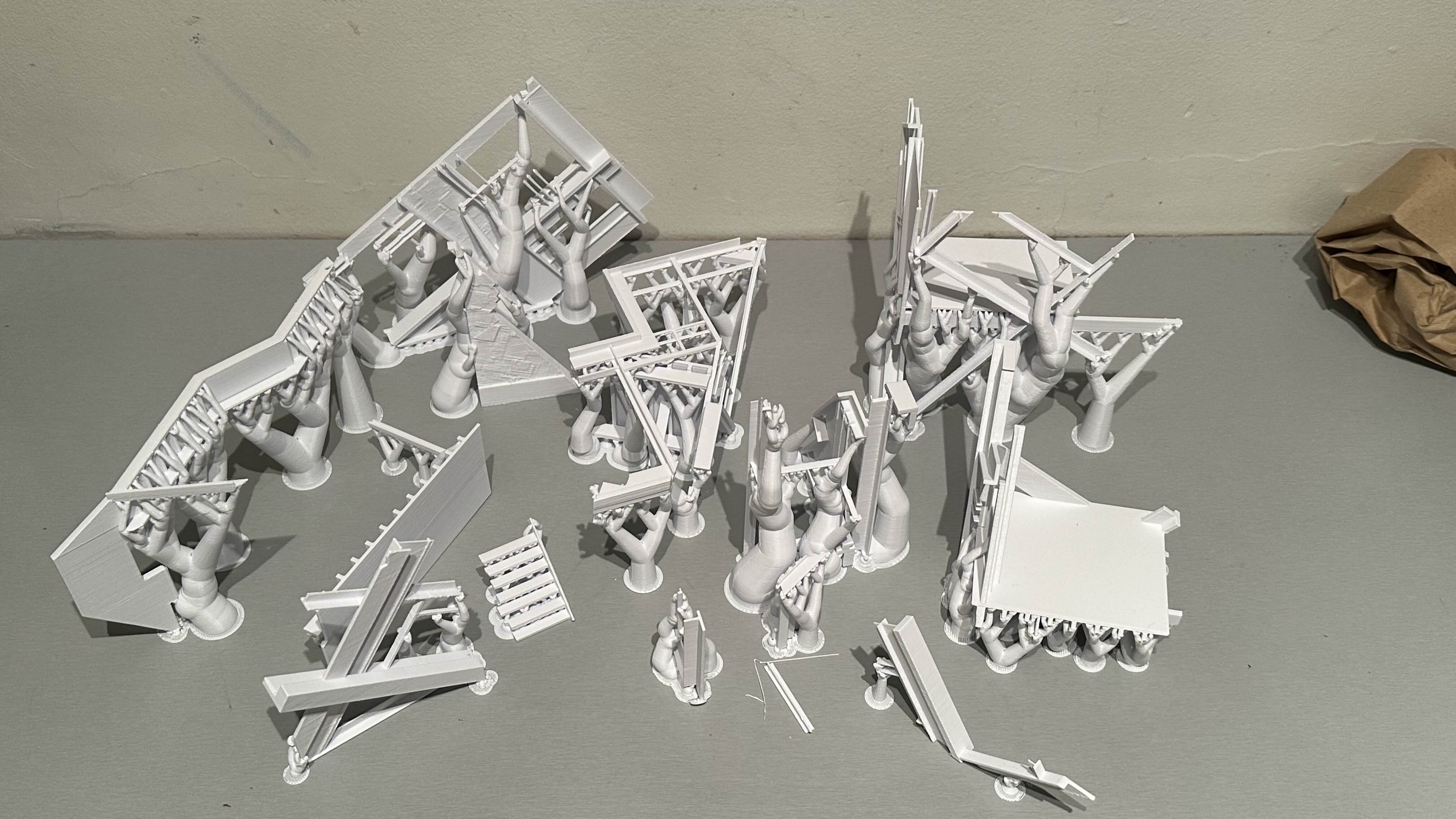 The most fragile and experimental components occur at the tertiary scale. These finer elements are designed as responsive surfaces that actively capture environmental matter. The use of 3D printed sawdust components allows the building to collect dust moisture seeds and airborne particles accelerating ecological growth while also concentrating zones of material breakdown. These elements are sacrificial by intent. Their degradation transfers stress away from more durable systems while recording environmental conditions through visible change. Damage is therefore redirected and curated rather than avoided.