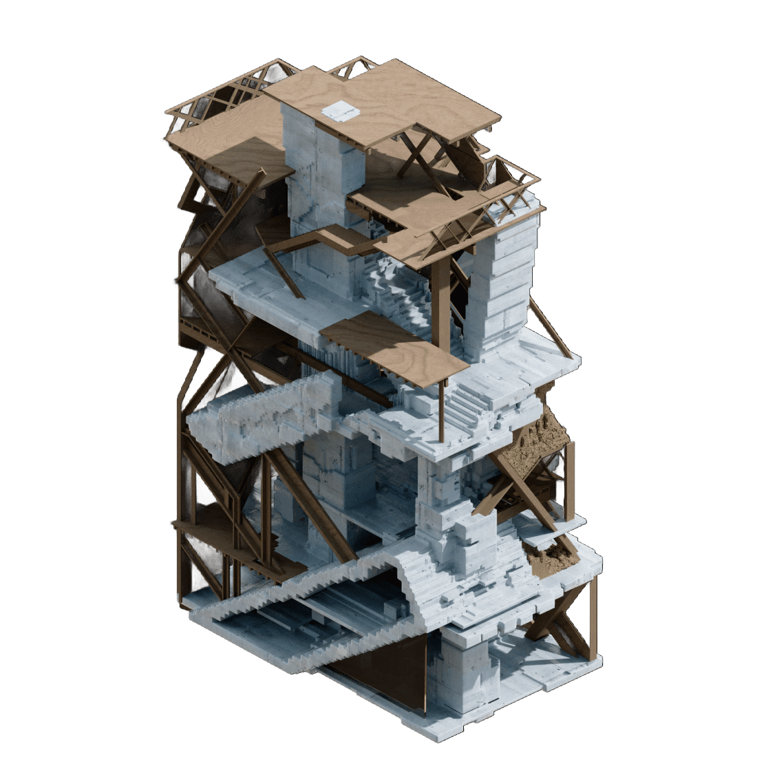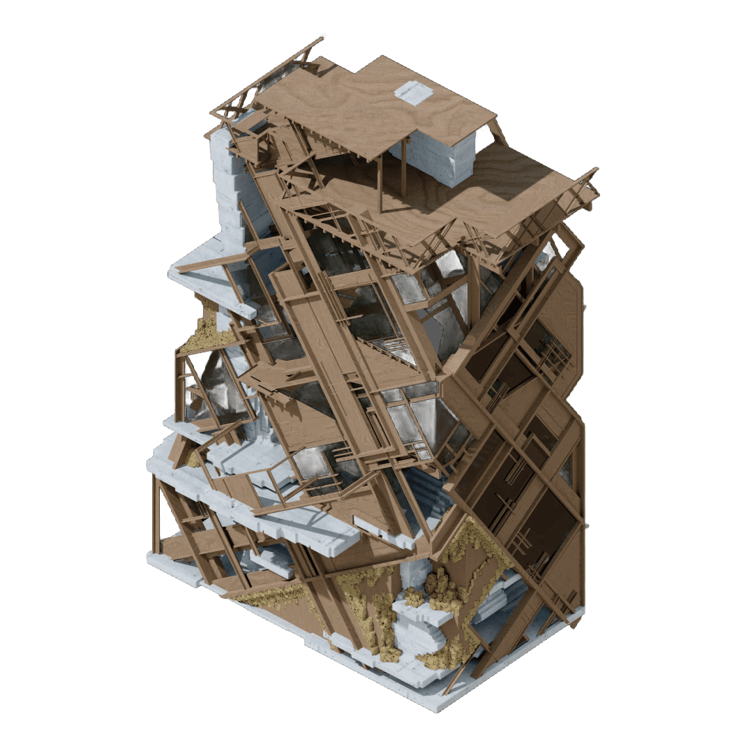 The project seeks to integrate degradation into the architectural lifecycle rather than resisting it. Weathering is treated as a formative process that actively contributes to the building’s evolution. The architecture is conceived to pass through distinct stages of ageing where material breakdown disassembly and repair are anticipated and spatially productive. Time is not external to the project but embedded within its organisational logic allowing the building to register change as part of its identity.