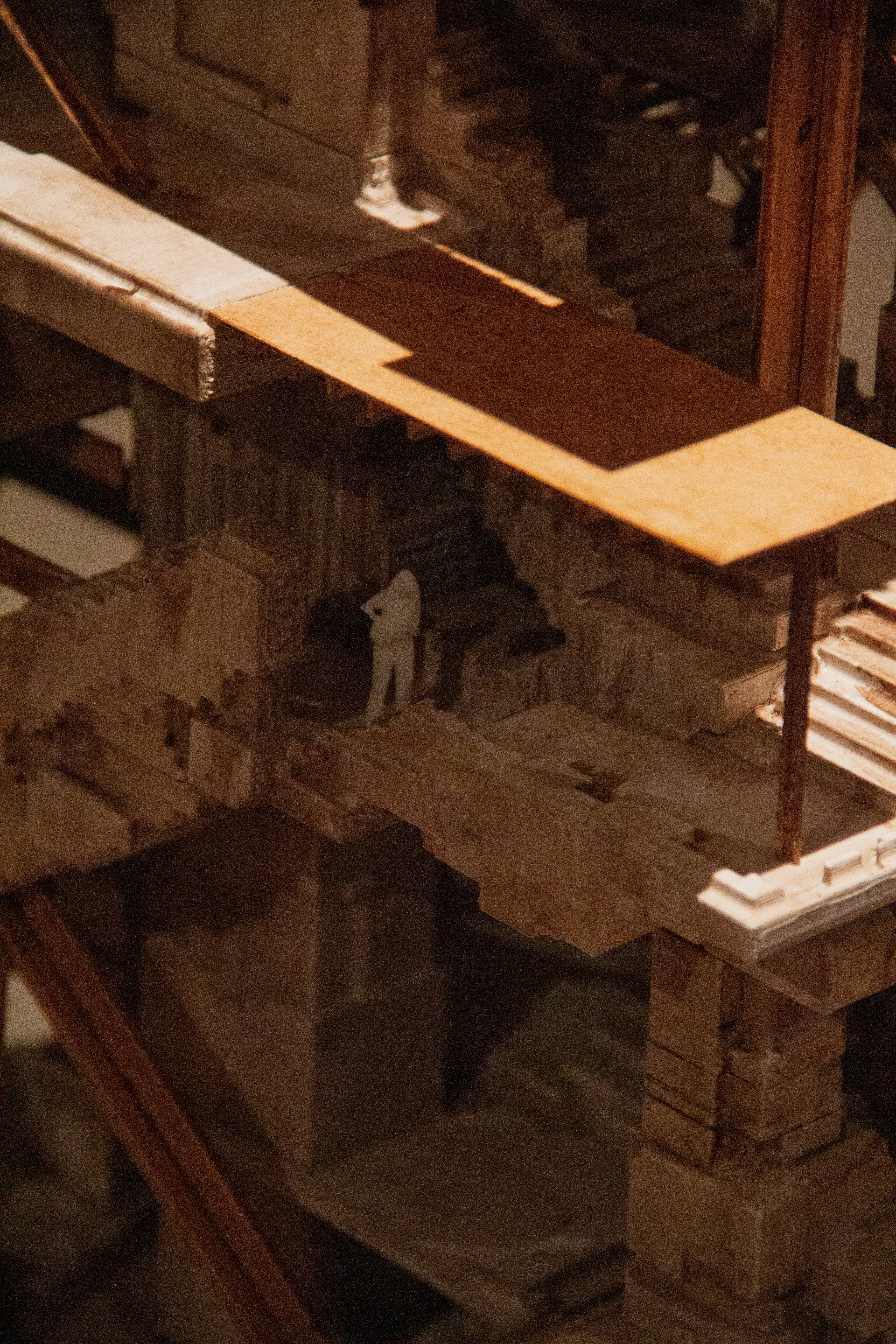 The secondary structure mediates between permanence and transformation. It introduces the human scale of occupation through inhabitable elements such as circulation platforms floors and internal partitions. This layer is intentionally exposed to environmental forces allowing it to become a site where decay and inhabitation intersect. It operates as a zone of interaction where human use ecological growth and material weathering occur simultaneously. Rather than separating interior from exterior this system encourages overlap allowing vegetation moisture and atmospheric conditions to enter the architectural experience.